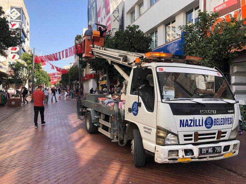 Nazilli Belediyesi, 29 Ekim Cumhuriyet Bayramı'nın 100. yıldönümü kutlamaları için hazırlıklarını sürdürüyor. Cumhuriyet coşkusunun yaşanacağı ve Gazi Mustafa Kemal Atatürk'ün anılacağı etkinlikler öncesinde kentin dört bir yanı Türk bayraklarıyla donatıldı. Sabah erken saatlerde çalışmalara başlayan ekipler, kentin en yoğun olduğu Belediye Meydanı, Uzun Çarşı ve ana caddeleri ay yıldızlı al bayraklarla süsledi.