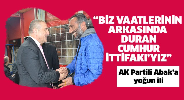 Vatandaşlarla konuşan Abak, “Biz verdiği sözü göreve gelince unutanlardan, sandık ufukta görününce vaat bohçasını açıp seçim sonrası üzerine yatanlardan değiliz. Biz sözüne, kavline sadık, vaatlerinin arkasında duran Cumhur İttifakı’yız. Milletimizin beklentilerini boşa çıkarmamakta kararlıyız.” ifadelerini kullandı.
