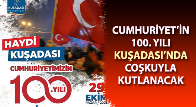 Gazi Mustafa Kemal Atatürk önderliğinde ilan edilen Cumhuriyet'in 100’üncü yıl dönümü, tüm Türkiye’de olduğu gibi Kuşadası’nda da düzenlenecek çeşitli etkinliklerle kutlanacak. Kuşadası Belediyesi tarafından Türk bayrakları ve Atatürk posterleriyle donatılan kentte, kutlama etkinlikleri 28 Ekim Cumartesi günü Saat 09.30’da kaymakamlık binasında düzenlenecek tebrik merasimiyle başlayacak. Ardından 10.30’da Özer Türk Stadı’nda öğrenciler ve mülki amirlerin katılacağı resmi tören yapılacak.