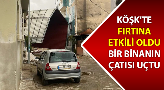 Aydın'ın Köşk ilçesinde dün gece saatlerinde etkili olan şiddetli yağış ve fırtına sonrasında bir binanın çatısı uçtu, devrilen ağaç duvarı yıktı.