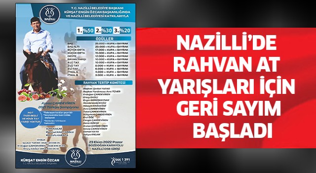 Belediye Başkanı Kürşat Engin Özcan’ın başkanlığında ve Nazilli Belediyesi’nin katkılarıyla düzenlenen 10. Geleneksel Rahvan At Yarışları, 23 Ekim Pazar günü Bozdoğan yolu üzeri Organize Sanayi Bölgesi girişinde bulunan sosyal etkinlik tesisinde yapılacak.